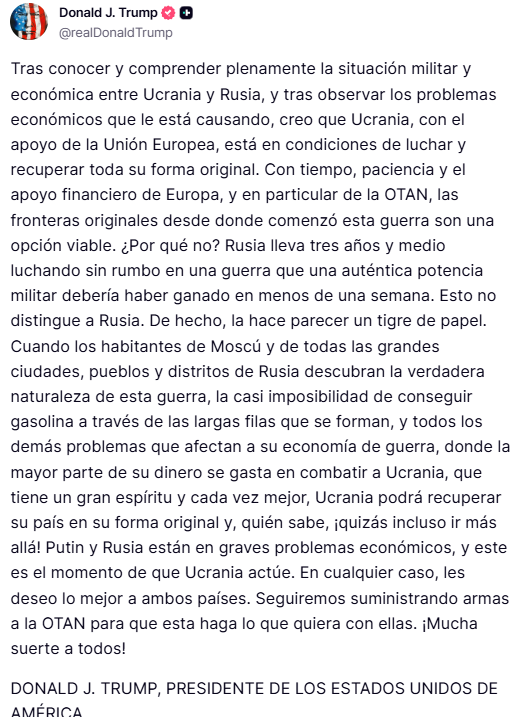 Trump señaló en su red social Social Truth que “Rusia lleva tres años y medio luchando sin rumbo en una guerra que una auténtica potencia militar debería haber ganado en menos de una semana”. Estas declaraciones, que buscaban resaltar las dificultades del Ejército ruso en el frente, fueron rechazadas por el Kremlin.